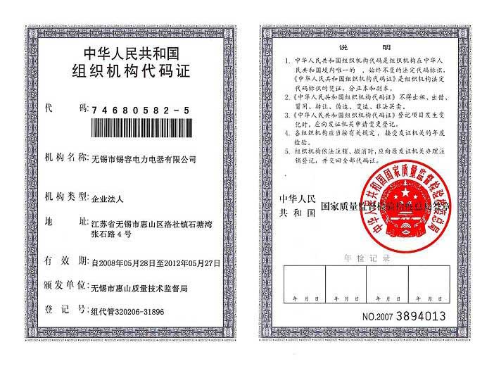 Organization code certificate release time:2020-07-20 04:35:16source:Wuxi Xirong Electric Appliance Co., Ltd.Click:1757