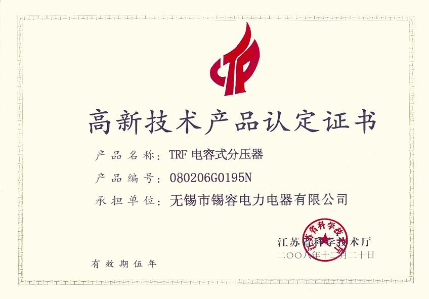 高新技術產品認定證書